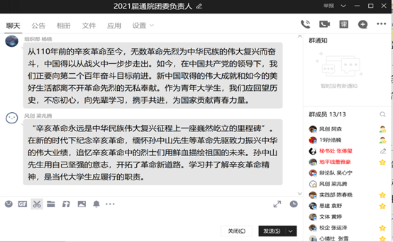 团委组织团干开展学习习近平总书记在纪念辛亥革命110周年大会上的讲话的线上交流会,会议由秘书处负责人张俸玺主持。通过观看纪念辛亥革命110周年大会直播回放及了解辛亥革命相关内容等方式,团干们针对习近平总书记在纪念辛亥革命110周年大会上的讲话所传达出的精神展开积极讨论。