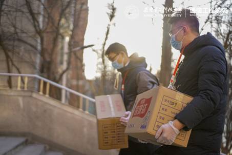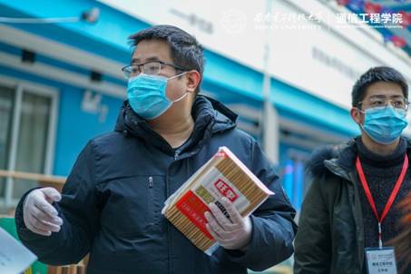 党员先锋岗的志愿者们为同学们分发物资