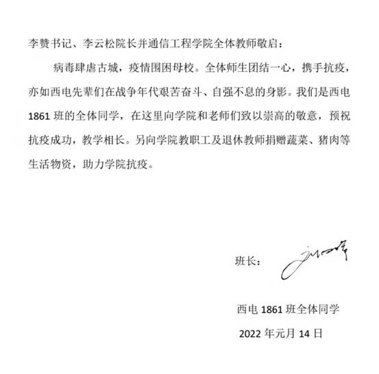 度过了最美好的大学时光,也很荣幸成为了1861班一员。现在西安疫情,饮水思源,我们作为西电学子,也想尽一点微薄的力量,向母校尽一份责任,感谢学院老师曾经的谆谆教诲。”