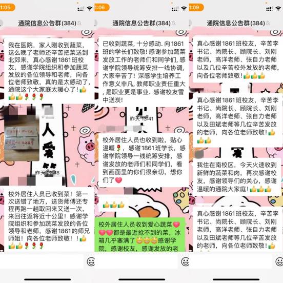 党委书记李赞表示,“在疫情防控的特殊时期,学院教师收到校友捐赠的爱心蔬菜、猪肉等生活物资,大家倍受感动和鼓舞,也让这个寒冷的冬日变得有温度,更加坚定了我们战胜疫情的决心和信心。真心感谢1861班的同学们,希望同学们能够在疫情解封、春暖花开的时候回学院看一看。”
