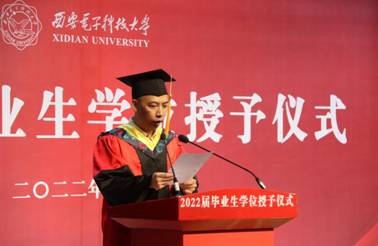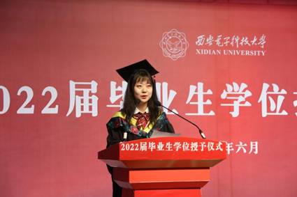 信息工程专业毕业生赵唯珂作为学生代表发言。她在发言表达了对师长和学院的感恩,四年来在通院成长与收获的感动,以及对通院历史与精神的感怀。号召毕业生同学牢记“厚德求真,砺学笃行”的校训,坚毅前进,踏实做事,成为社会栋梁。