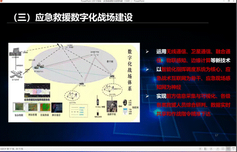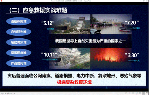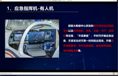 接下来,房主任用仅仅3分钟的视频就让同学们更直观的了解应急行业提出的数字战场具体包含什么功能,采用了什么技术,能够解决什么现实问题。视频展示了该平台的六大功能体系,包括实时三维建模、全要素的物联感知生命目标搜救、可视化辅助决策和融合指挥调度等实战功能。他还指出了三维建模当前技术瓶颈以及在实战救援中的核心作用,给后续科研目标提供了新的支撑。视频最后还出现了“战鸿”载人固定翼空中应急指挥机起飞画面,房主任介绍道:整个数字战场体系最核心的就是这个空中的有人机或者无人机。“战鸿”是与中电科联合研发的国内外首款载人固定翼空中应急指挥机,已经实现试飞并参与了一些具体的这个实战救援。