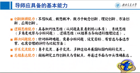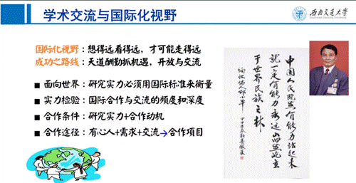 在学术交流和国际化视野部分,范平志强调,研究生培养过程一定要具备国际化视野,坚持开放交流的路线。他从学术交流的方法与途径,学术交流的能力培养两个具体的方面展开,对如何进行国际交流提出了自己的看法。