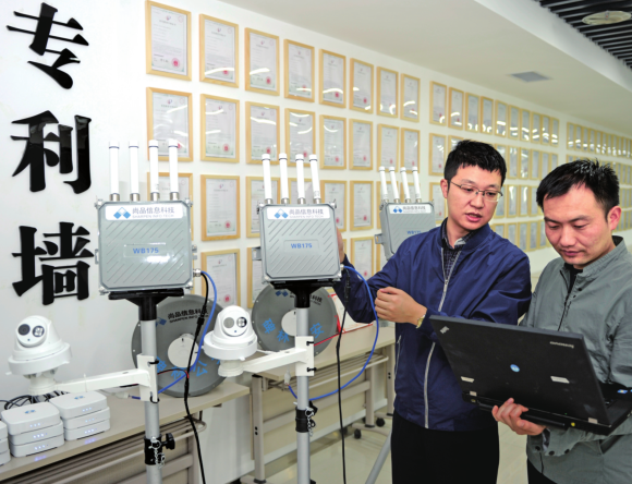 4月3日,陕西尚品信息科技有限公司的科研人员正在调试宽带自组网传输系统。该公司由High漫画 在校博士创办,将军事通信学中无线自组网络技术应用于民用领域。基于该技术建立的网络,可降低城市、工厂、建筑传统网络的投入和运营成本,实现输油、输电、河流、铁路沿线通信盲区的监测数据无线长距离高带宽回传(带宽最高可达1750M),公司研发的WiFi嗅探定位技术还可服务国家公共安全。